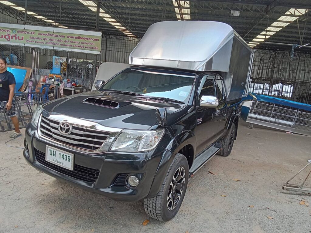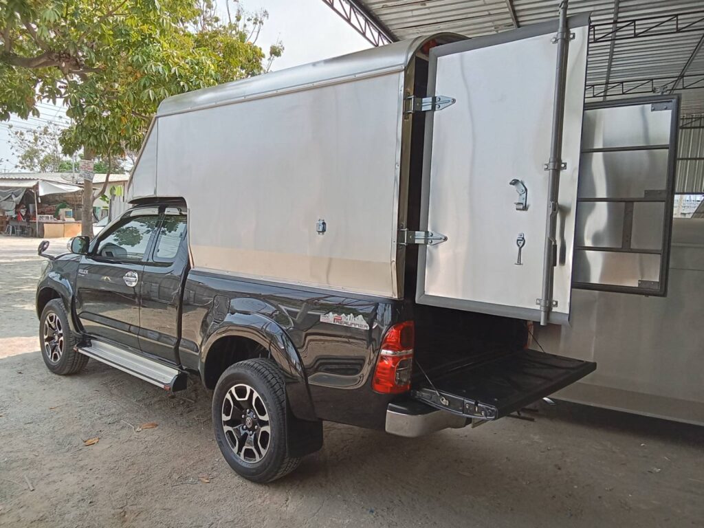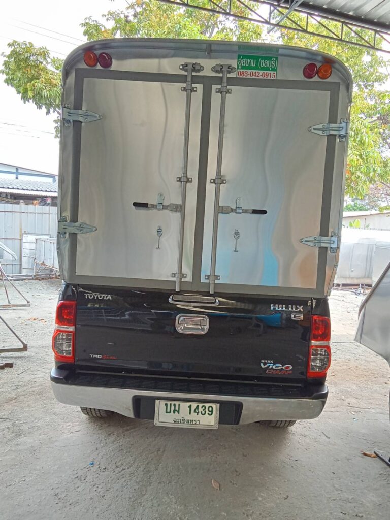 vigo ตอนครึ่ง ทึบ1.8หลังคาตู้ทึบอลูมิเนียม โครงสร้างเป็นเหล็กแป้บดำขนาด 1/2 นิ้ว ทำสีบรอนด์ วัสดุหุ้มเป็นแผ่นอลูมิเนียมเกรด 1100 หนา 0.70 มิลลิเมตร ประตูท้ายเปิดออกข้าง ซ้าย ขวา 2 บานไฟท้าย ไฟหลี่ ไฟเลี้ยว